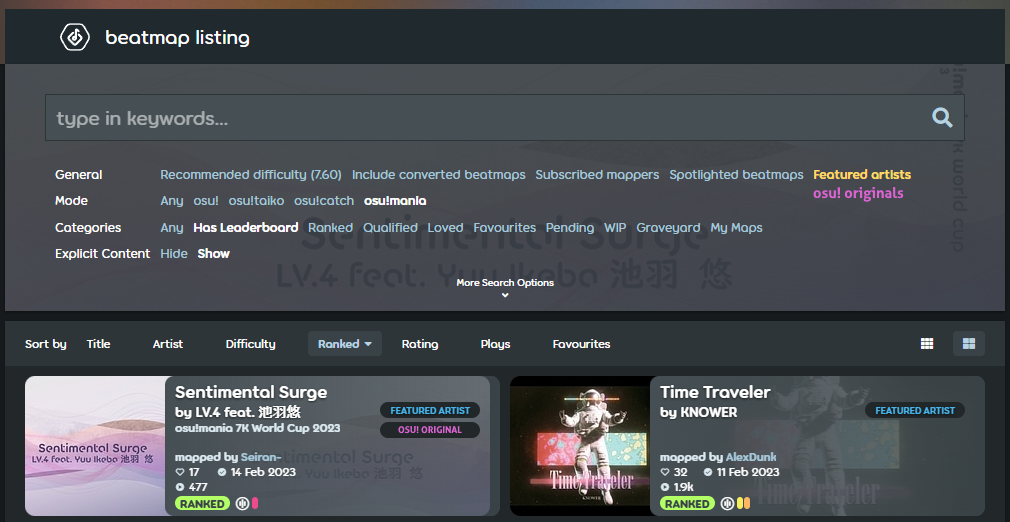 osu! originalsfilter: Exactly the same as the Featured Artist implementation. Quick button to quickly sort all beatmapsets using this content.