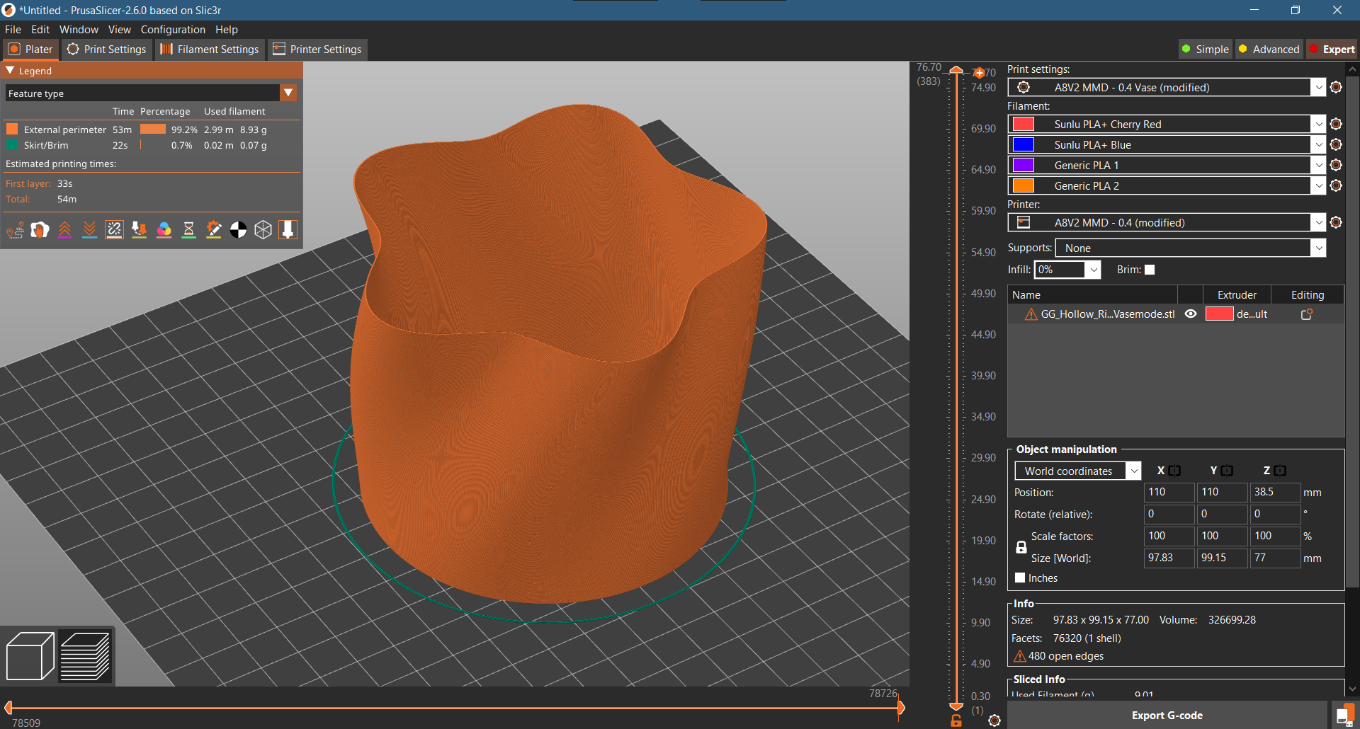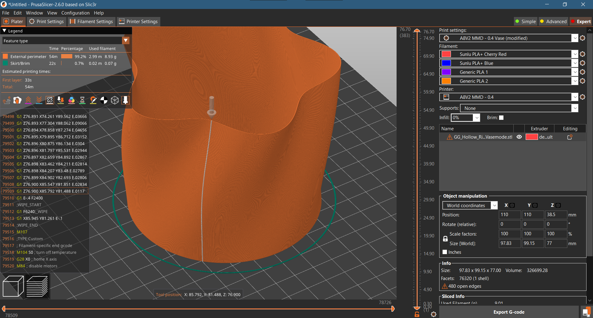 - Re-arrange the Z positions of the extrusion, so its going uphill (this is being done now and this makes it the vase mode)