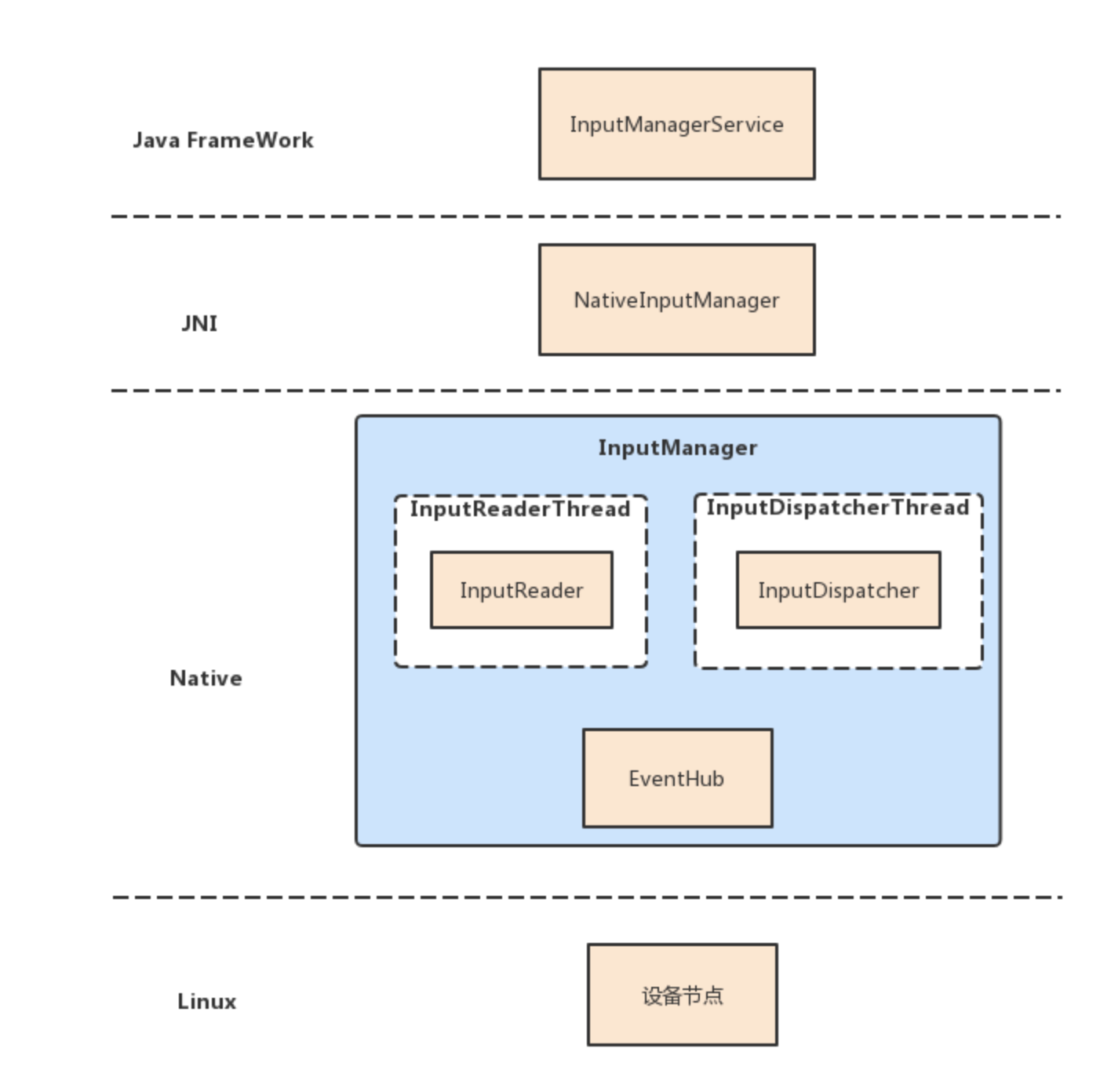 此时我们已经处于Native层级。读者需要注意,对于整个Native层级而言,其向下负责与Linux的设备节点中获取输入,向上则与靠近用户的Java层级相通信,可以说是非常重要。而在该层级中,EventHub和InputManager又是最核心的两个角色。