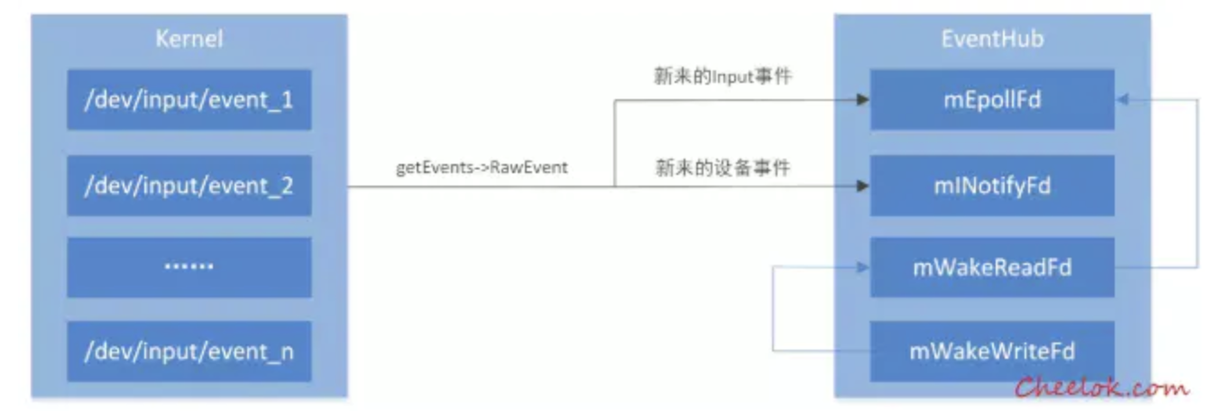 EventHub中使用epoll的恰到好处——多个物理输入设备对应了多个不同的输入流,通过epoll机制,在EventHub初始化时,分别创建mEpollFd和mINotifyFd;前者用于监听设备节点是否有设备文件的增删,后者用于监听是否有可读事件,创建管道,让InputReader来读取事件: