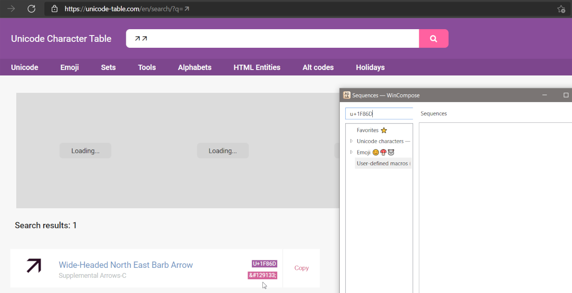 Though, the barb arrow <Multi_key> <n> <e> <b> <a> : "🡭" # Barb Arrow U1F86D was still not shown in the user defined macros, i found it only when i searched for it.