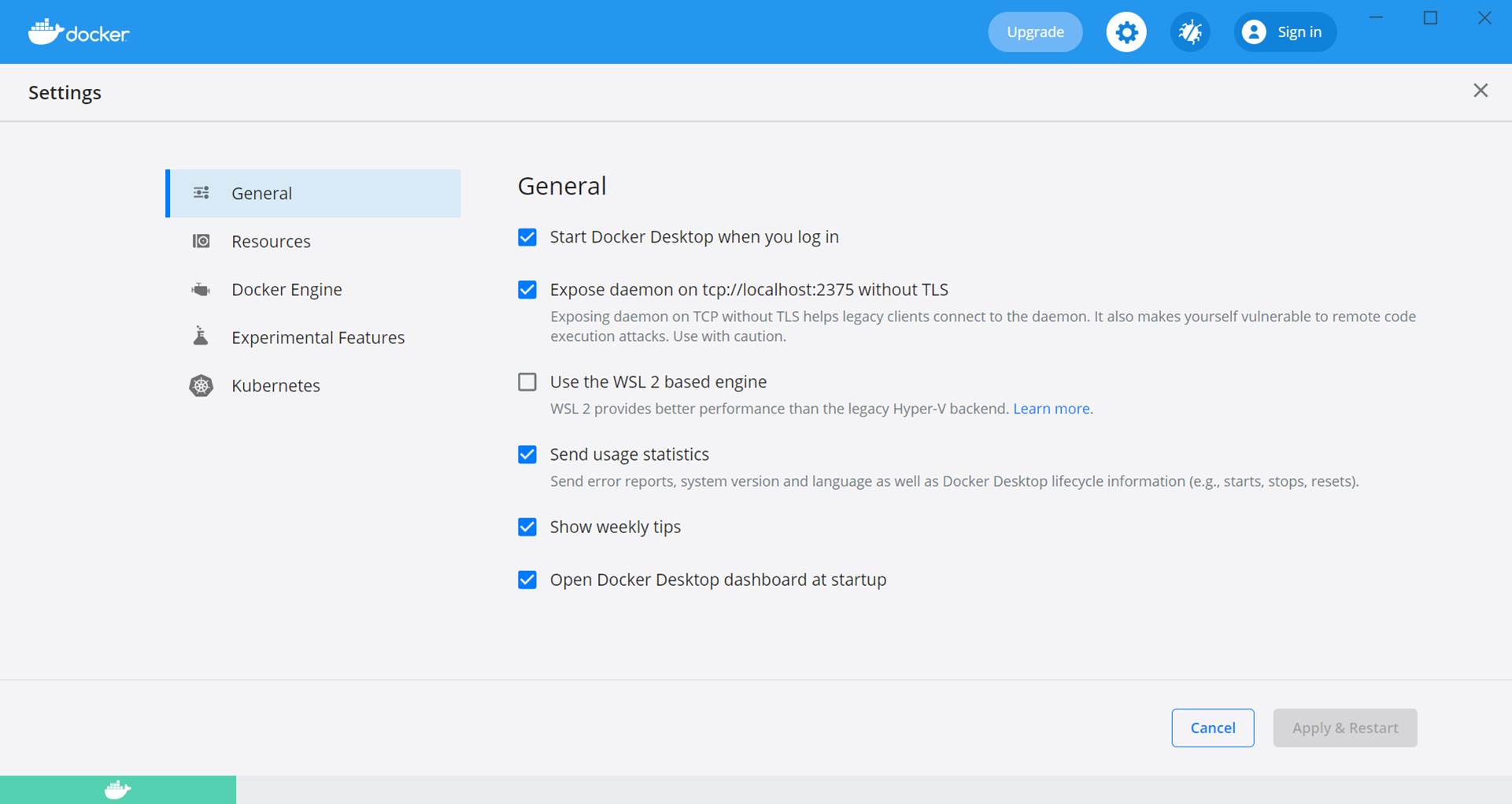 In Docker Desktop settings, uncheck General -> Use the WSL2 based engine: