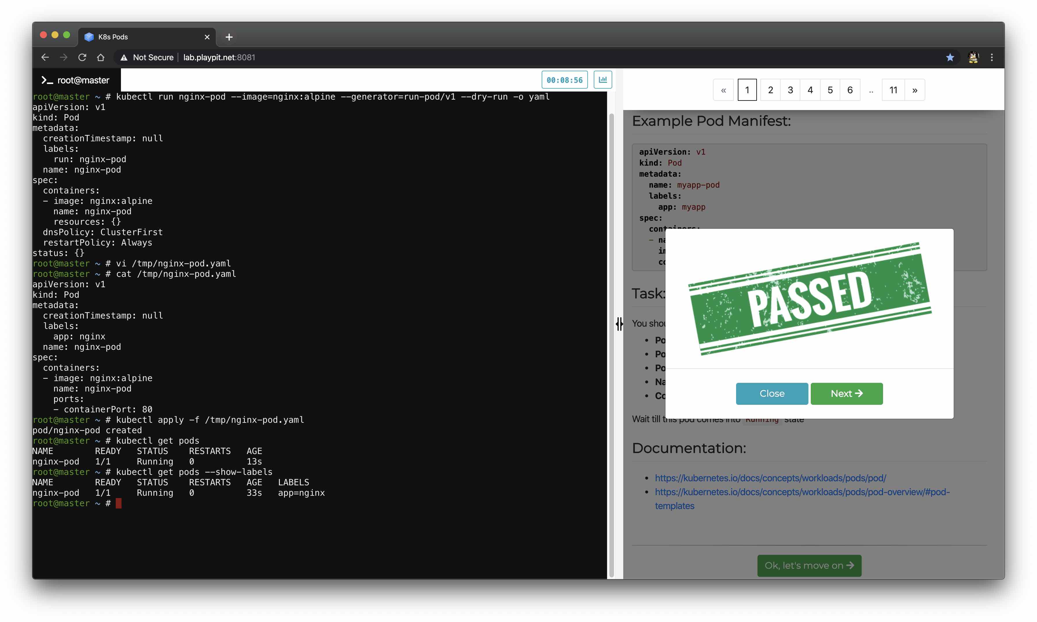 Based on a hands-on experience, the Platform delivers scenario-related approach with instant feedback. So, the user can easily navigate his training path - learn, practice, instantly check the results and track the progress in the personal report in the course of a chosen technology or a tool (currently available courses - Docker and Kubernetes).