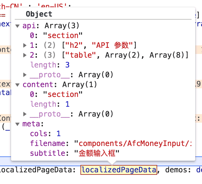 routes.index.js中的collector函数中将 utils(包括 plugins 如jsonml-to-react-element)传入到浏览器端的组件中(通过 props),在各个页面中,通过调用 props.utils.toReactComponent 将 JsonML 转换为 react element,渲染出页面。在 antd-fincore 中,经collector函数处理后的数据示例如下: