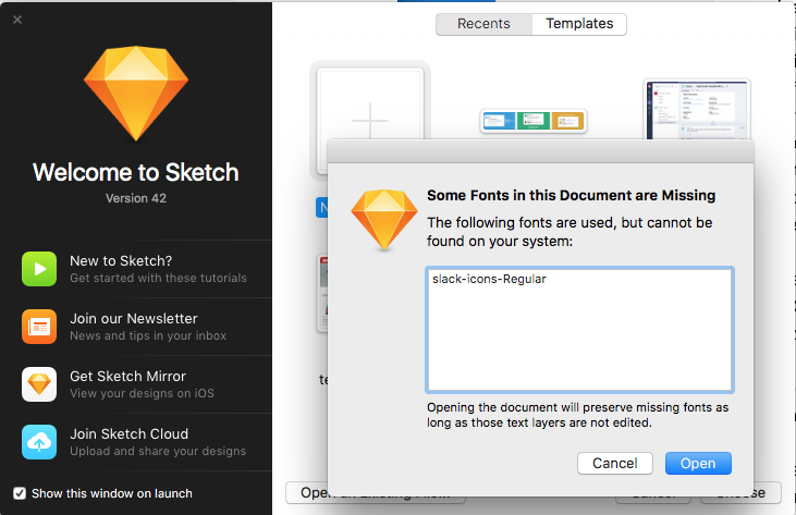 When I try to use the Sketch template, I get a warning that slack-icons-Regular fonts are missing. I have already installed all the Lato fonts locally, fwiw.