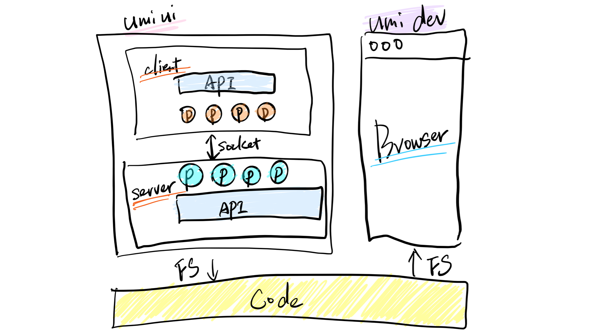 左边是是 UMI UI,右边是通过 UMI DEV 启动的预览页面,两边是通过 CODE 通信的,即 UMI UI 里做修改,会作用于代码,代码变更后会触发 webpack 编译,然后作用于预览页面。