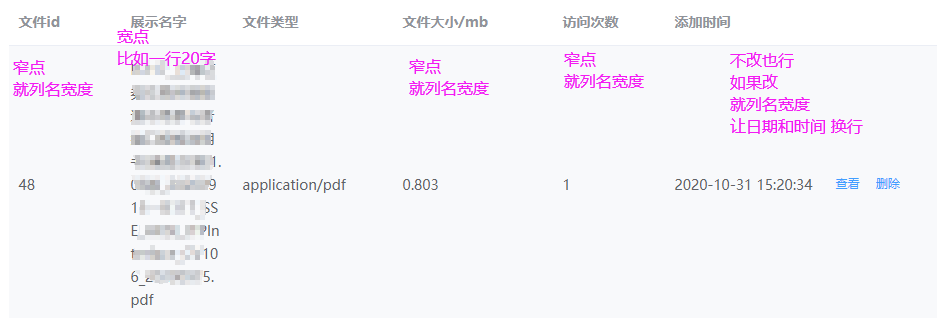 - 【更多-我的附件】里的展示页面,展示名字、文件类型 可以宽点,其他的可以窄点,文件名可能十几个字或更长的话,会换成三四行。其他如文件大小、访问次数、ID可能不需要那么宽。 [image: image] https://user-images.githubusercontent.com/74750630/100300161-5de62900-2fd0-11eb-86dc-44087606915c.png