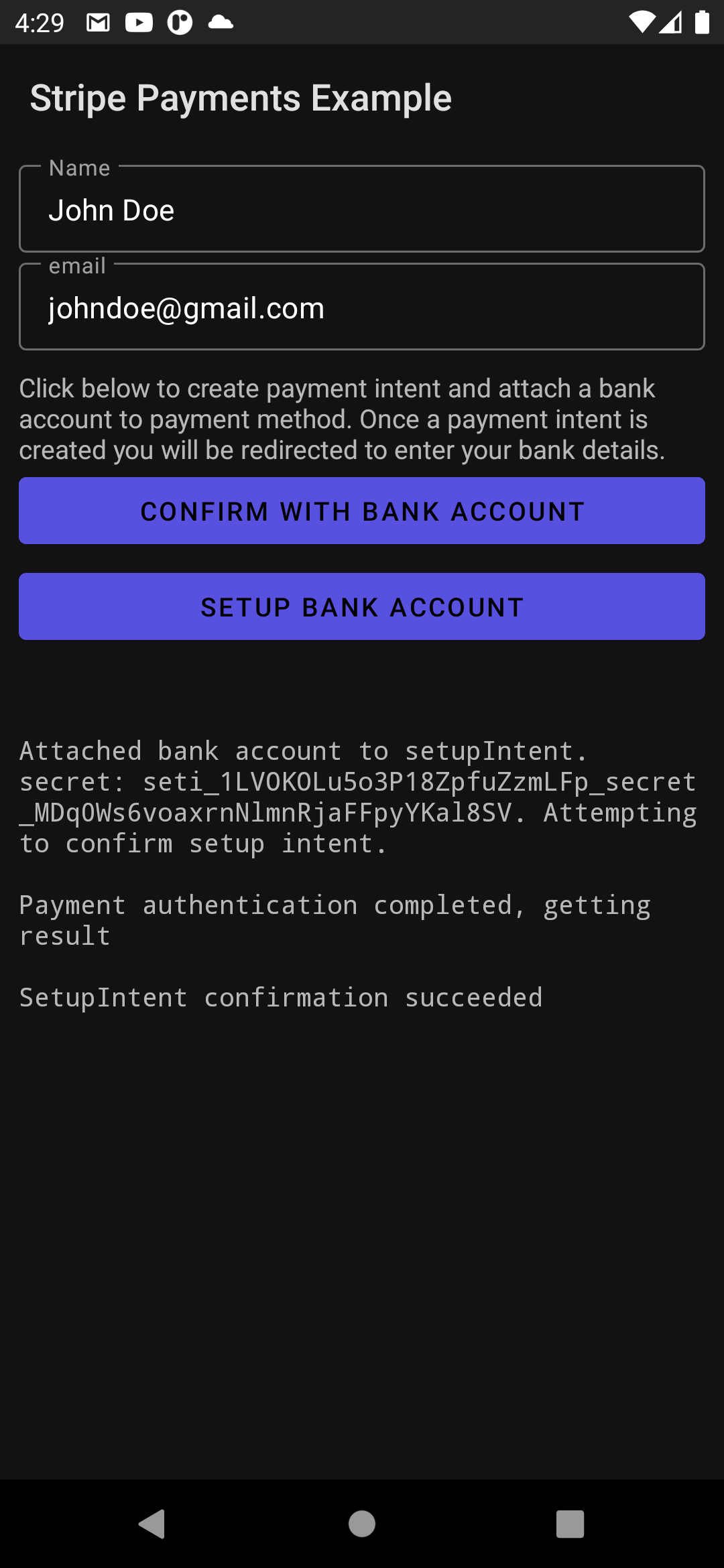 Add setup to connect bank account example