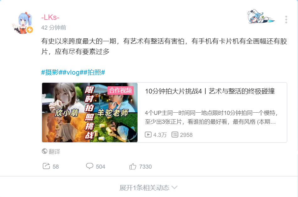 (顺便测试了下 特效小哥studio,其在动态首页中的投稿动态也会被折叠进相关动态,测试两个以上 UP 主的场景应该可以加上)