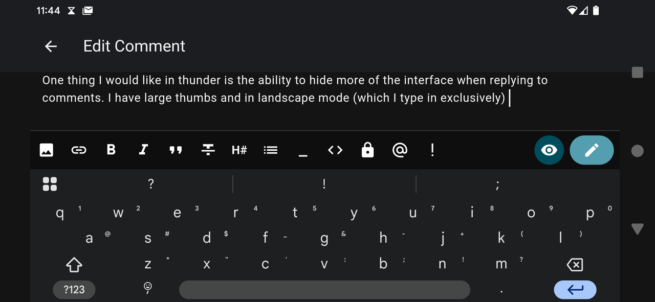 When typing comment replies in landscape orientation space is at a premium. Current layout has a ton of wasted space that could be better used for seeing what I'm typing and what I'm replaying to.