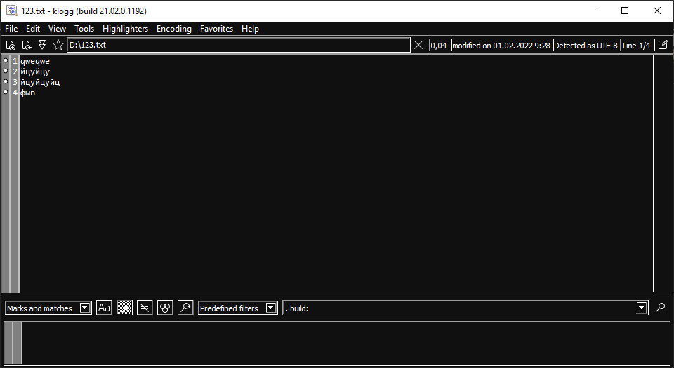 21.12.0.1175 x64 on Windows 10 version 1809 LTSC x64 - thanks for this! Unfortunately, I don't see klogg.conf file neither in installation path nor in %AppData% - only klogg.ini in the latter, but it doesn't contain the mentioned parameters