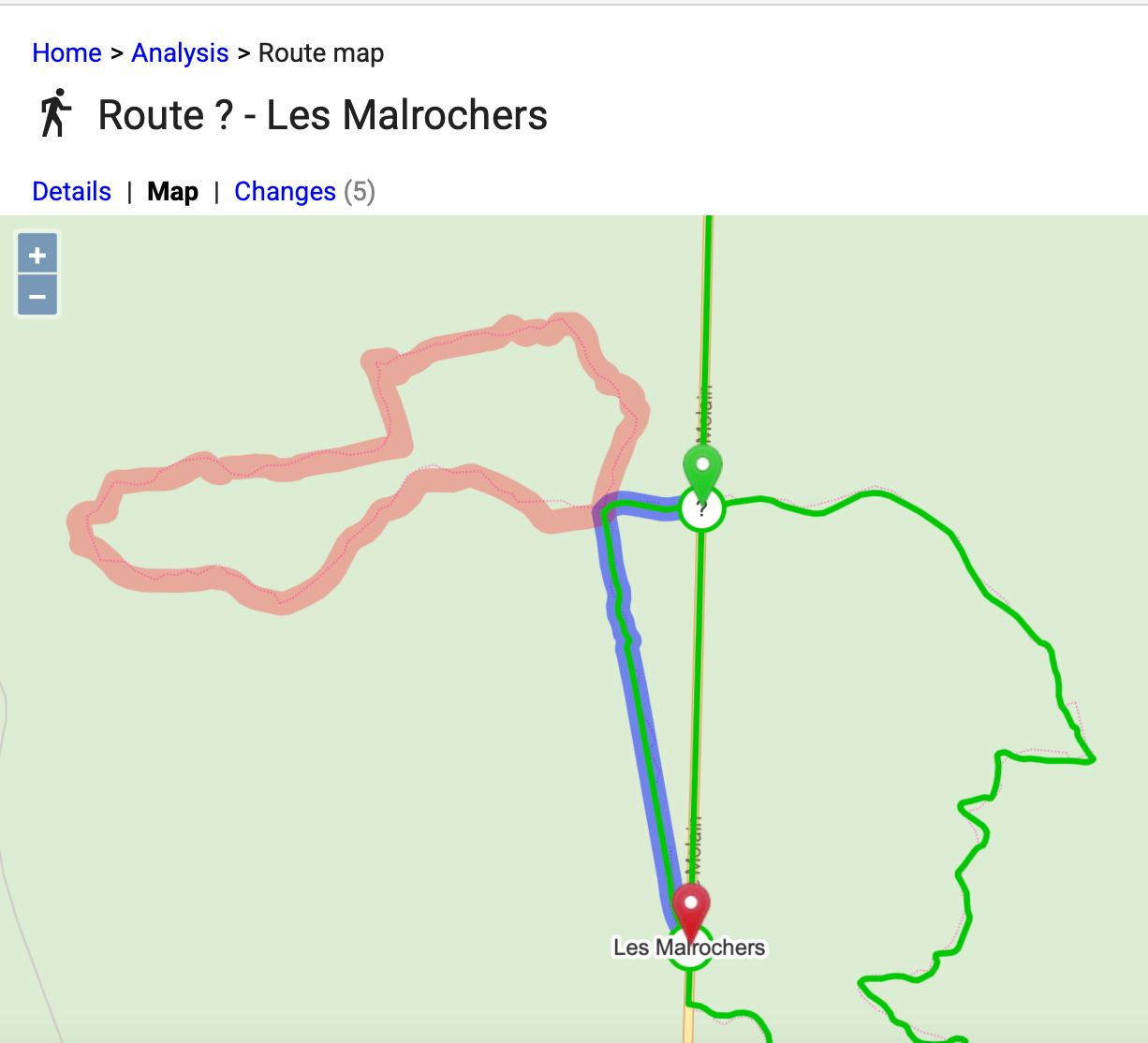 Currently, no detailed route analysis is performed for routes that are a loop or contain a loop (where part of the route is re-using the same ways to get back to that start of the route). The route is marked with RouteOverlappingWays and no further analysis is performed.