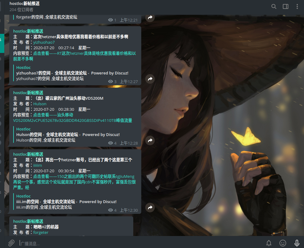 目前已开通了推送频道,可自行点击查看推送效果:https://t.me/hostloc2tg