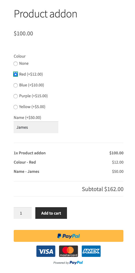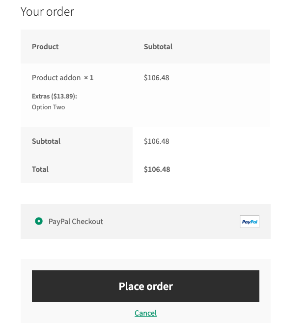 - Select multiple checkbox add-ons, upload a file and purchase with PPEC on the single product page