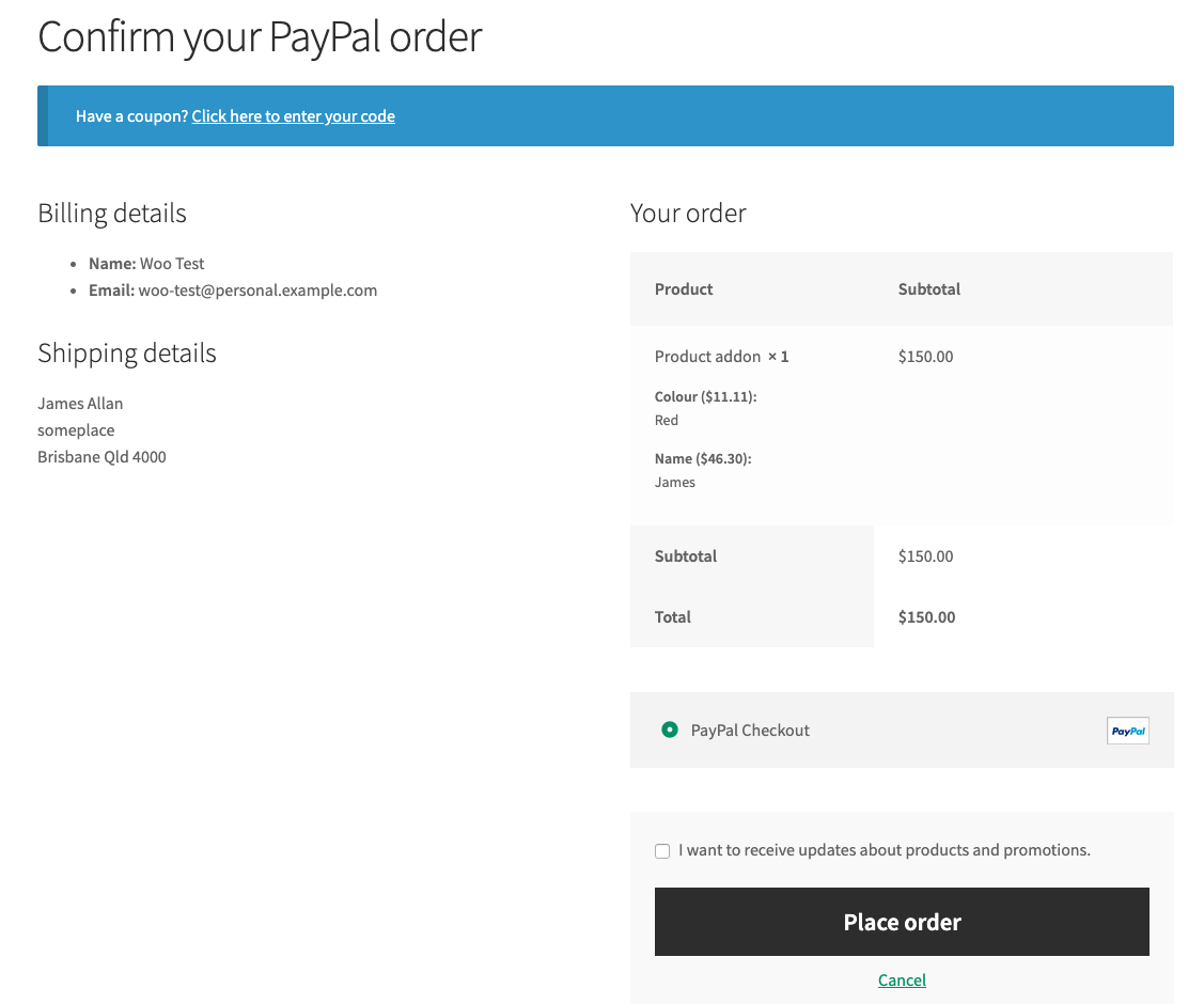 - After clicking the PayPal button on the single product page and completing the modal I'm returned to the store with the addons intact.