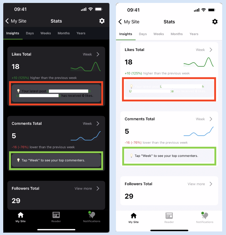 The Stats' Insights screen should adapt instantly to changes in the device's Dark/Light mode settings.
