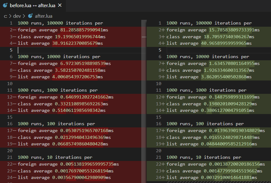 I did a little bit of measuring and compared creation of a foreign, a class, and a list for interest sake. The right hand side is with this patch applied, left is before. Still a synthetic benchmark, but interesting still, e.g seems to typically scale linearly across the extra 0.