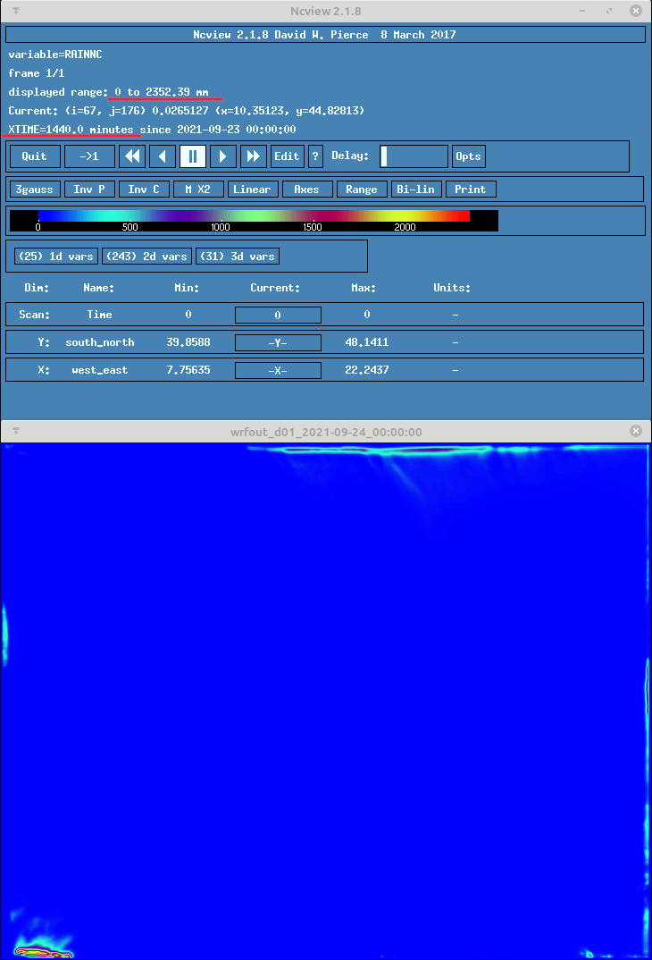 Judging from description of new feature from mr. Thompson PR #1323 the effect on simulation should be dramatic, and it certanly does improve simulation in first hours within domain significantly. However, I feel that something is not implemented properly, as it can be seen from included screenshots, where run with option turned on produces >2500 mm or rain during 24h, while run without option turned on produces maximum of ~5 mm of rain during the same simulation period. No other changes to namelists or forcing data has been made between these two experiments, except insert_init_cloud being .true. or .false.