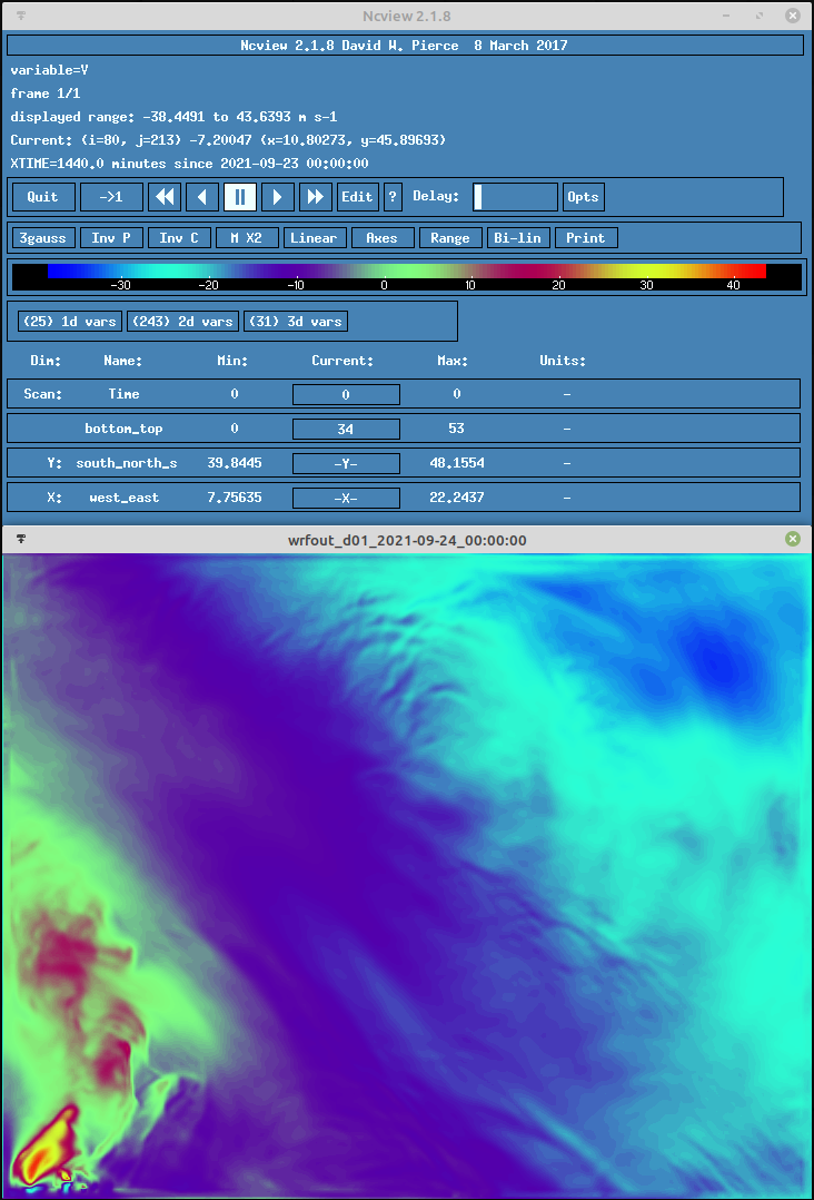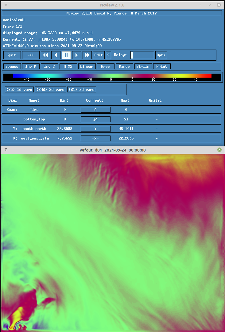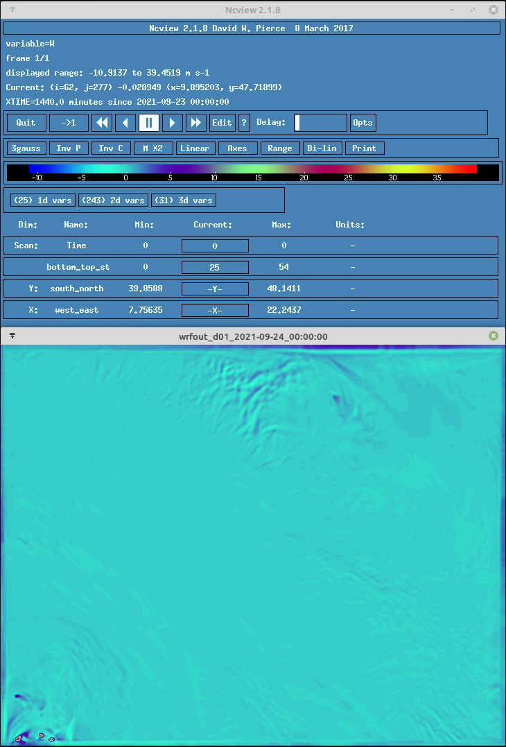 Few additional fields (u,v,w) that show the intensity of the storm near south-west corner, 24 hours after the start of simulation: