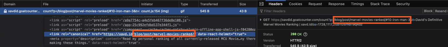 @arp242 Thanks for the response! I added the canonical path to each page, but I'm still seeing requests to goatcounter include the hash:  That page is the following: https://xavd.id/blog/post/marvel-movies-ranked...