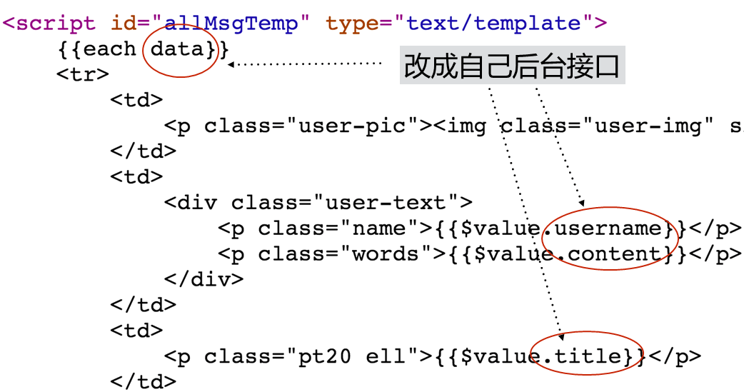 HTML模板字符放置在页面上,不要内联到JavaScript中,这样,开发可以根据自己习惯改变下图所示的这些字段名称: