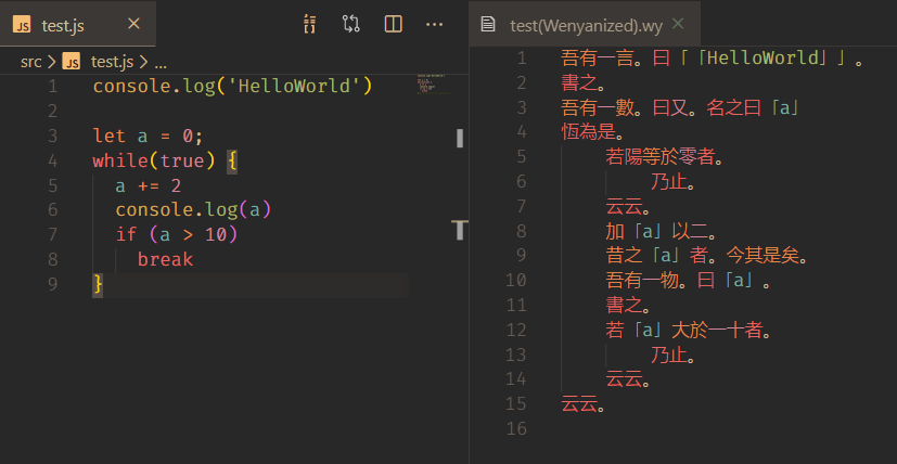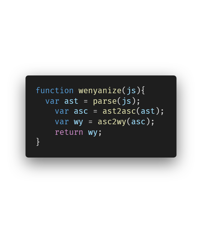 Inspired by the great Wenyan Lang project, which compile ancient Chinese Language to javascript code, I build this project to do the opposite thing -- to parse javascript to Wenyan.