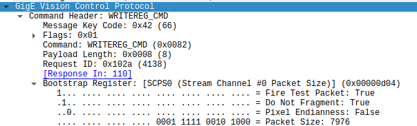 I had a bit of a look at the packet size auto negotiation with eBUSPlayer (free windows download, or a paid Linux version) with wireshark. It seems it is writing a series of different packet sizes into the Stream Channel #0 Packet Size register, with a bit set to fire a test packet, and request no fragmentation. See attached image. But Aravis accepts the write register command, but because it doesn't know about that register, the value is ignored, same with the flags, so no test packet is fired. Eventually, eBUSPlayer gives up, and reports setting the packet size to the fallback value of 1476, although curiously in the trace it sets it to 2000 (which causes fragmentation on a standard MTU of 1500).