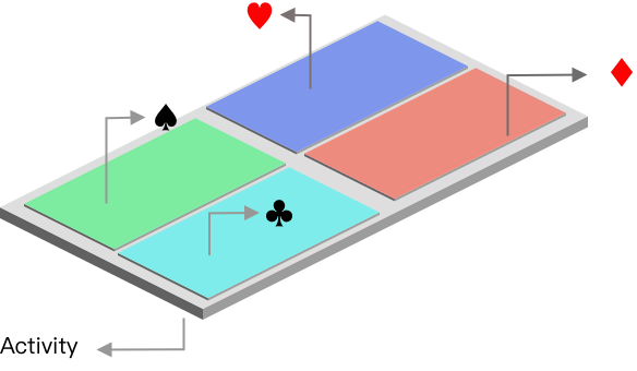 如下图所示,Activity 中使用四个 FragmentContainerView 作为不同花色扑克的容器。