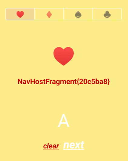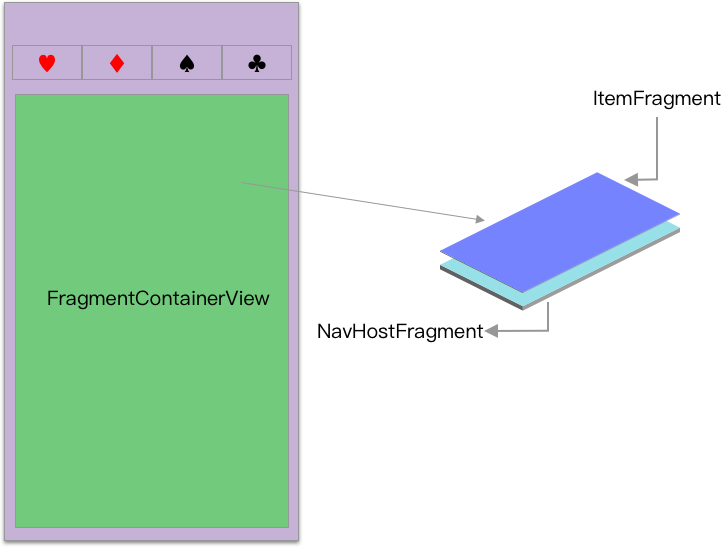 如上图所示,绿色部分为 Fragment 容器,顶部四个 tab 分别对应不同花色。创建四个 NavHostFragment(自定义的,与 navigation 无关)。点击其中一个花色 tab 便将对应的 NavHostFragment attach 到容器,并将其它 NavHostFragment dettach。最终效果如下:
