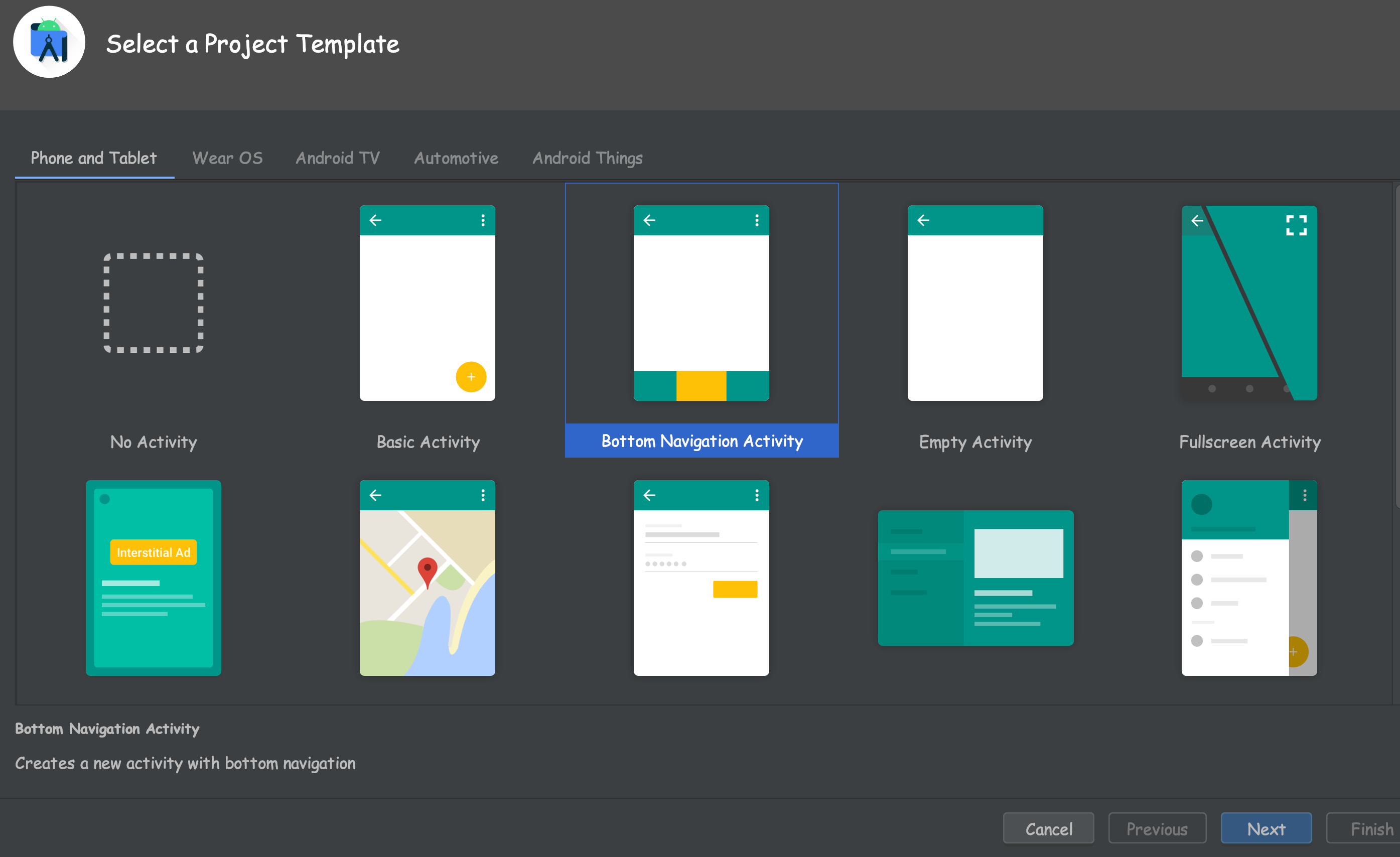 新建 Project,选择 Bottom Navigation Activity 模版: