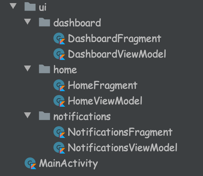 该项目由一个 Activity(MainActivity) 以及三个 Fragment(Home,Dashboard,Notifications)组成。