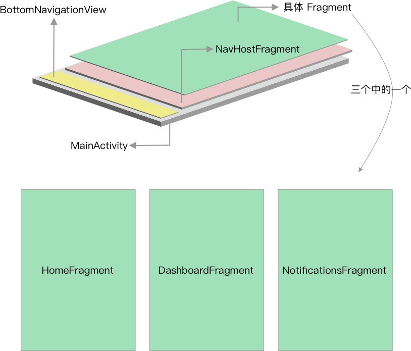 在内部,三个 Fragment(Home,Dashboard,Notifications)都由 androidx.navigation.fragment.NavHostFragment 管理,即使用 NavHostFragment 的 FragmentManager 管理返回栈。