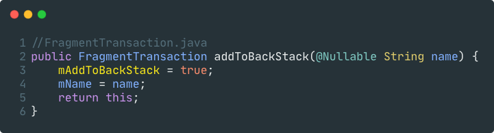 public FragmentTransaction addToBackStack(@Nullable String name) {