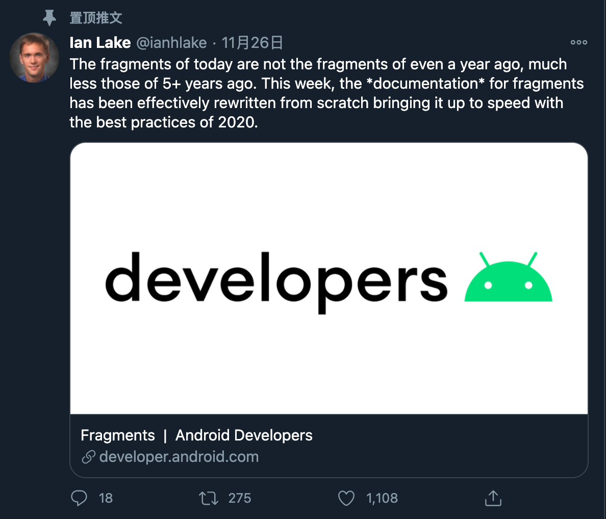 # 前言 很高兴见到你 👋,我是 Flywith24 。 最近 Android 官方针对 Fragment 文档进行了重新编写,使其适应 2020 年最佳实践的快速发展。  Fragment 的确是一个让开发者头疼的组件,它是一个很好的设计,但一直处于可改进的状态,随着 AndroidX Fragment 的快速更新,Fragment 已不同往日,虽然仍有改进的空间(单个 FragmentManager 不支持多返回栈,Fragment 自身和其 view 的生命周期不一致)。考虑到该文档的确有很多新知识以及官方文档的极慢的汉化速度,本文将 2020 版 Fragment 的官方文档翻译成中文,喜欢一手信息的小伙伴可直奔 [官方原文](https://developer.android.com/guide/fragments/lifecycle)。如果只想关注新文档中的变化,可...