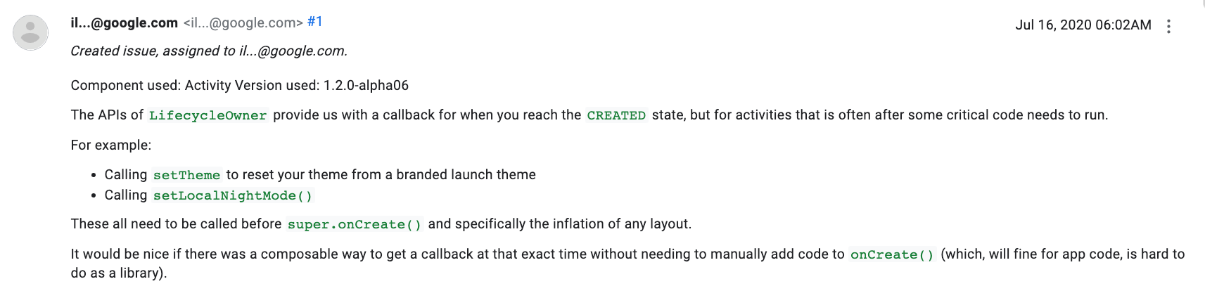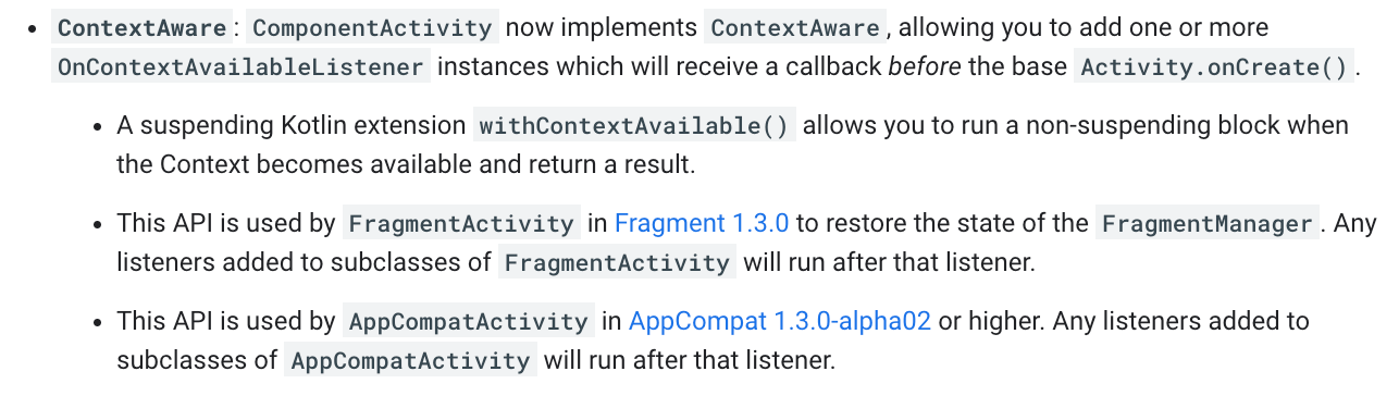 # 前言 最近 [activity 1.2.0 ](https://developer.android.com/jetpack/androidx/releases/activity#1.2.0) 正式版发布,除了全新的 Activity Result API (前面已有介绍),还引入了一个新的接口 `ContextAware`。  老规矩,我们沿着 git commit 查看该功能的引入过程。 # 引入原因 [IssueTracker](https://issuetracker.google.com/issues/161390636) 上提了这样一个需求:  `LifecycleOwner` API 提供了达到 `CREATED` 状态时的回调,但有些场景这个 API 不满足我们的需求。 例如:...