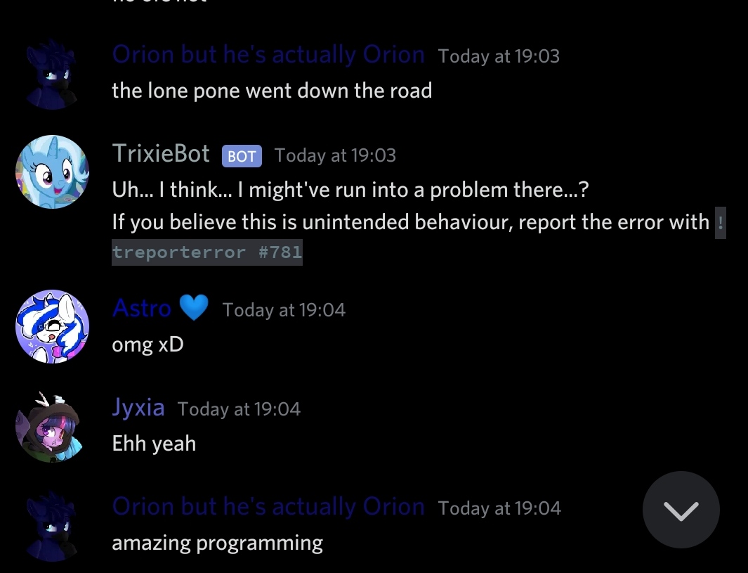 Someone in a server said lone pone, which triggered trixiebot to post an image, however bot didn't have Attach Files permission in that channel and ran into an issue.