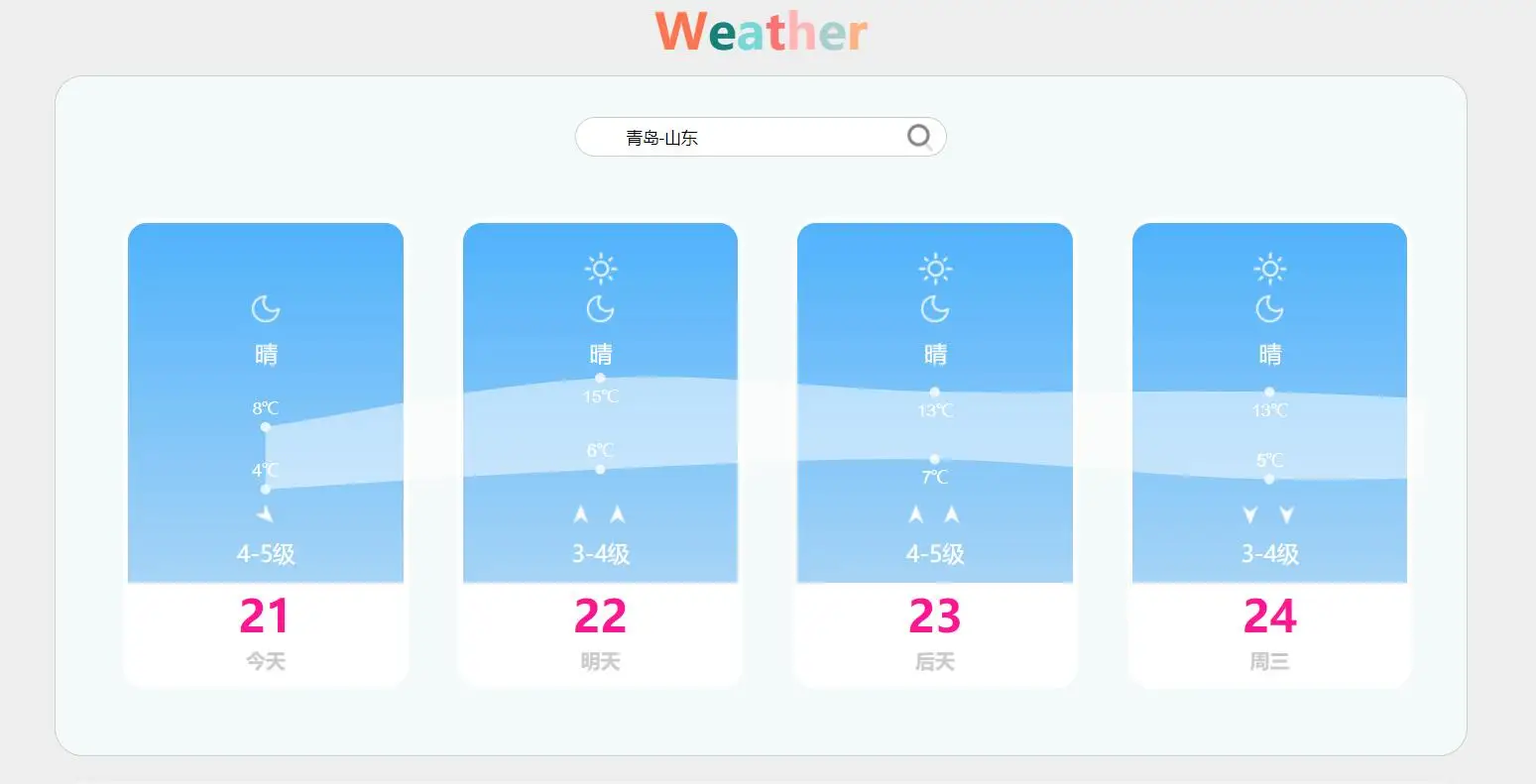 从中央天气网获取七天天气数据http://www.weather.com.cn/ 搜索框联想功能,根据输入联想位置名称和城市代码 窗体呈现,每一个卡片在hover时有三个动画,上升一定高度,阴影渐变出现,offset渐变增加,卡片上方按钮渐变出现