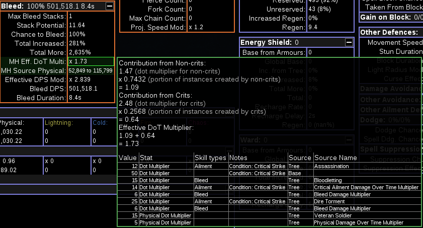 I think this is just multiplying the current crit rate by stack potential - on these lines of calcoffence.lua : if output.CritBleedDotMulti and (output.CritBleedDotMulti ~= output.BleedDotMulti) then local chanceFromHit = output.BleedChanceOnHit / 100 * (1 - globalOutput.CritChance / 100) local chanceFromCrit = output.BleedChanceOnCrit / 100 * output.CritChance / 100 local totalFromHit = chanceFromHit / (chanceFromHit + chanceFromCrit) local totalFromCrit = chanceFromCrit / (chanceFromHit + chanceFromCrit)
