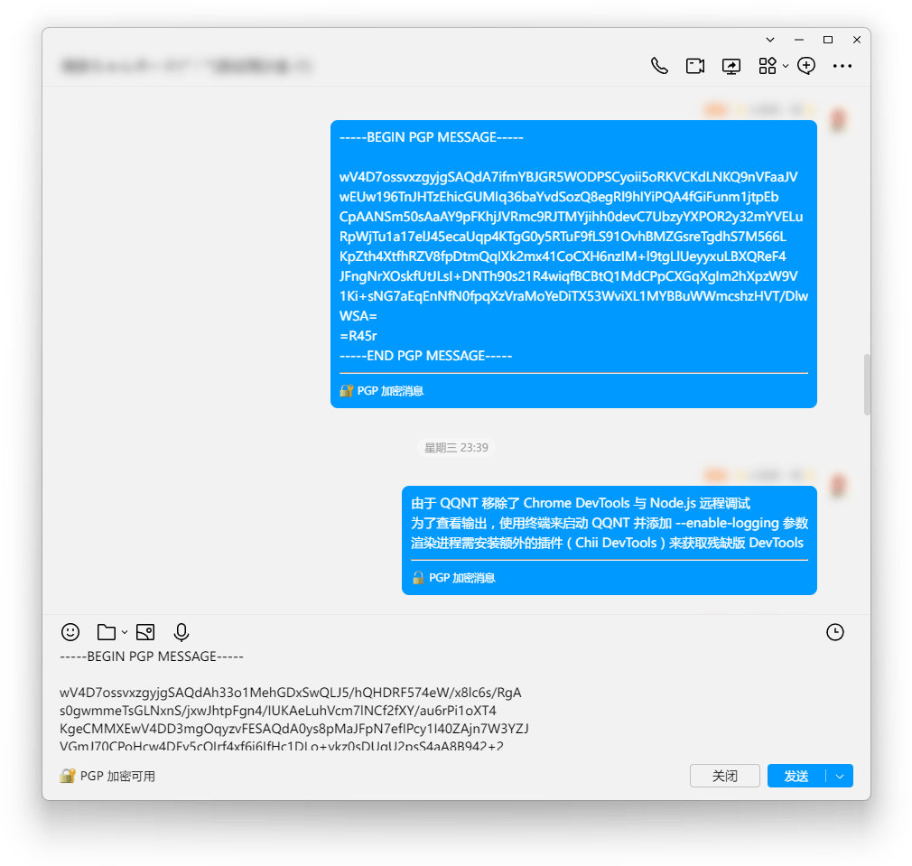 在 QQ 中使用 PGP 进行端到端加密,支持半自动加密和自动解密。