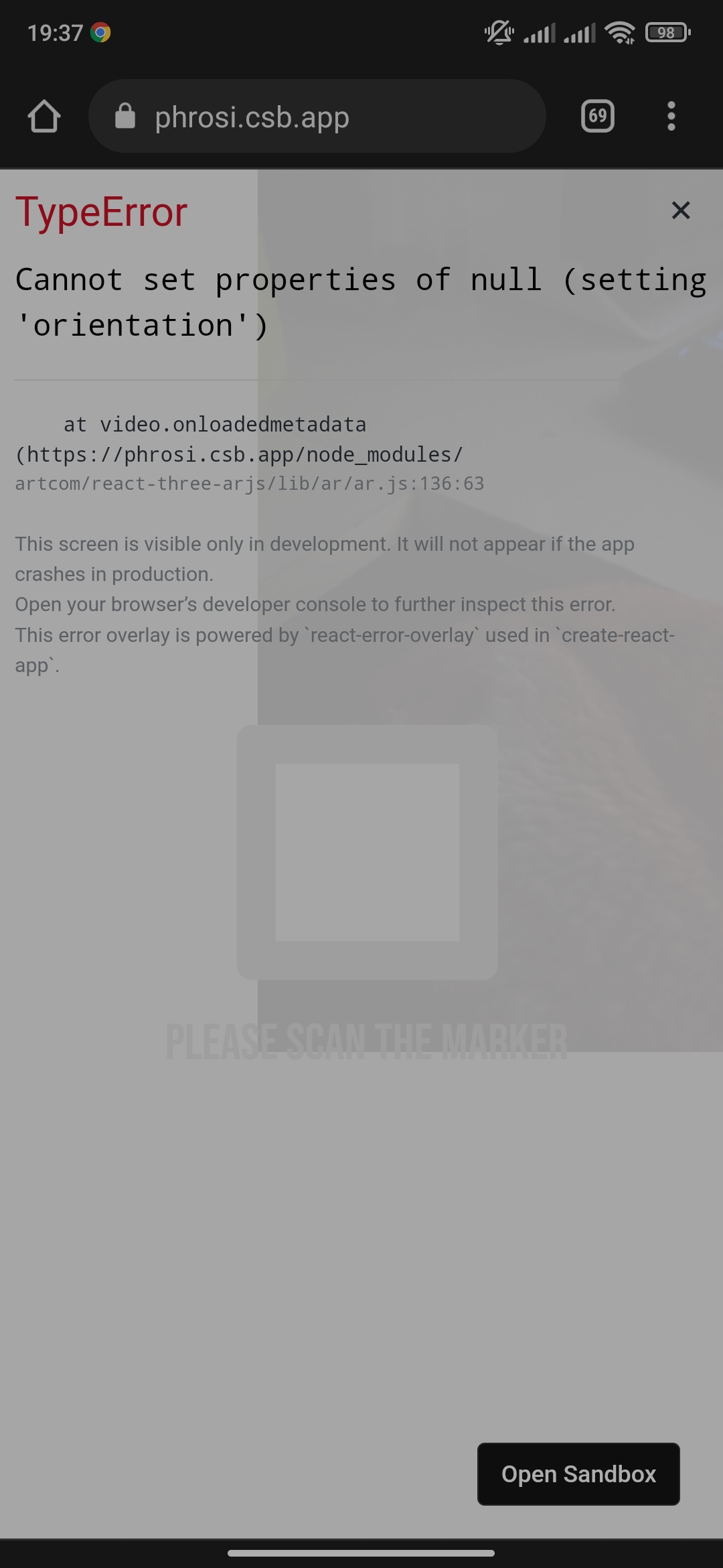 And this shows in the console ar.js:133 Uncaught TypeError: Cannot set properties of null (setting 'orientation') at HTMLVideoElement.video.onloadedmetadata (ar.js:133:63)