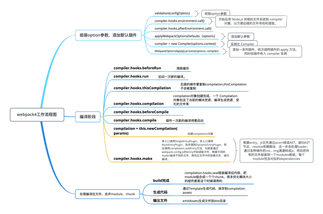 Webpack 本质上是一个模块打包器,可以根据依赖图来将我们的文件打包。  # 原理 Webpack 的生命周期借助于 tapable 。tapable 类似于发布订阅库,webpack 的 hooks 就是 webpack 的生命周期,里面都是 tapable 一个实例,webpack 在适当的时机会触发这些生命周期。plugins 本质上则是通过监听 hooks 来做一些自定义处理。 1. 根据文件配置,找到入口文件。 1. 编译入口文件,使用配置的 loader 来处理文件。 1. 将 loader...