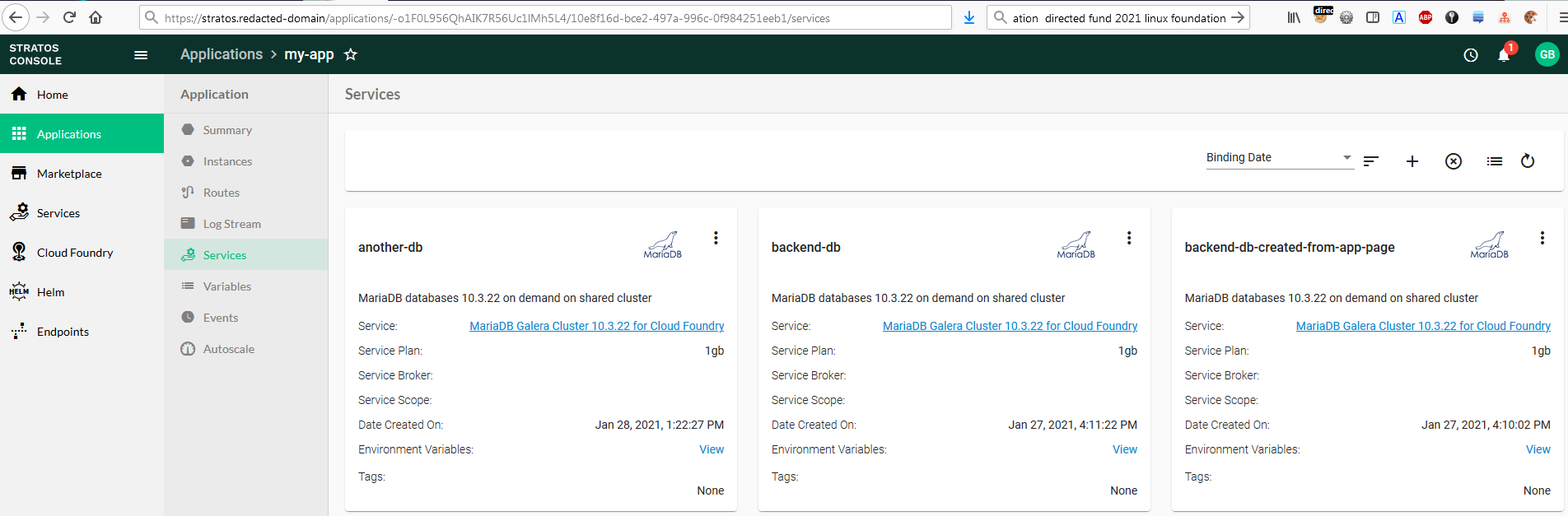 Additionally the application page has a tab called "services" (see screenshot1) which