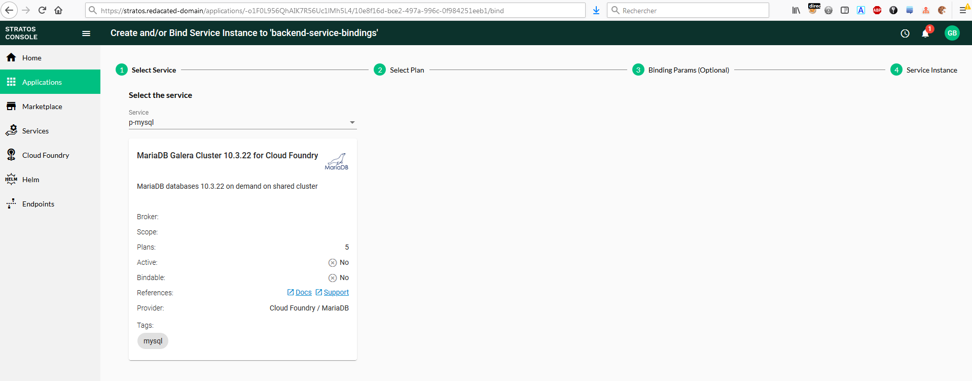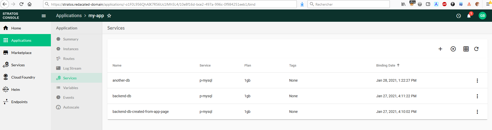 has a plus button which offers to create a service instance, instead of a "service binding" associated to the current app: see screenshot2 and screenshot3