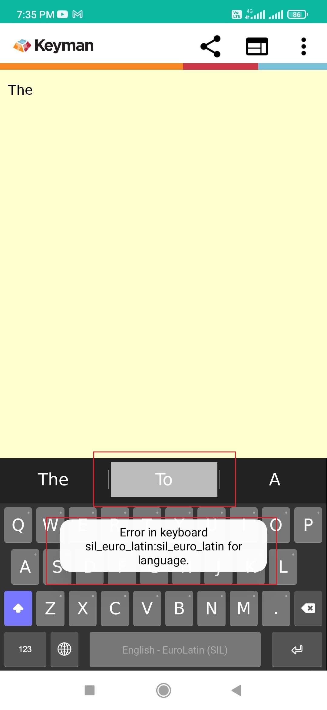 Here, I noticed that there is an error message "Error in Keyboard sil_euro_latin..." appearing on the Screen. Also, selecting the predictions from the banner, I noticed that the selected word appears with some other bg color.