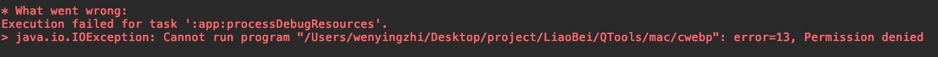 由于 linux 或 mac 权限问题,可以通过 chmod -R 777 /Users/wenyingzhi/Desktop/project/LiaoBei/QTools/mac/cwebp,给与此文件可执行权限。