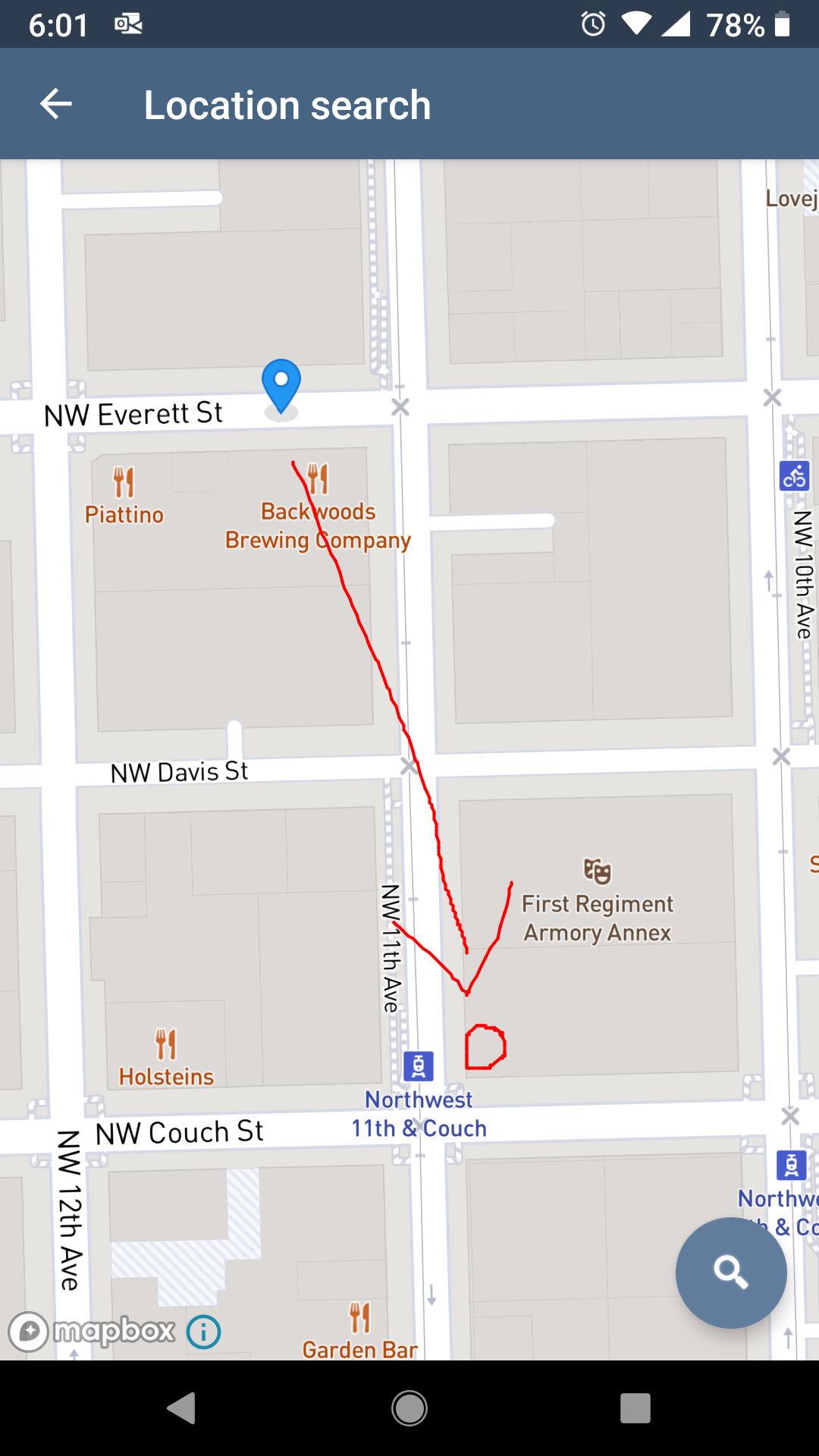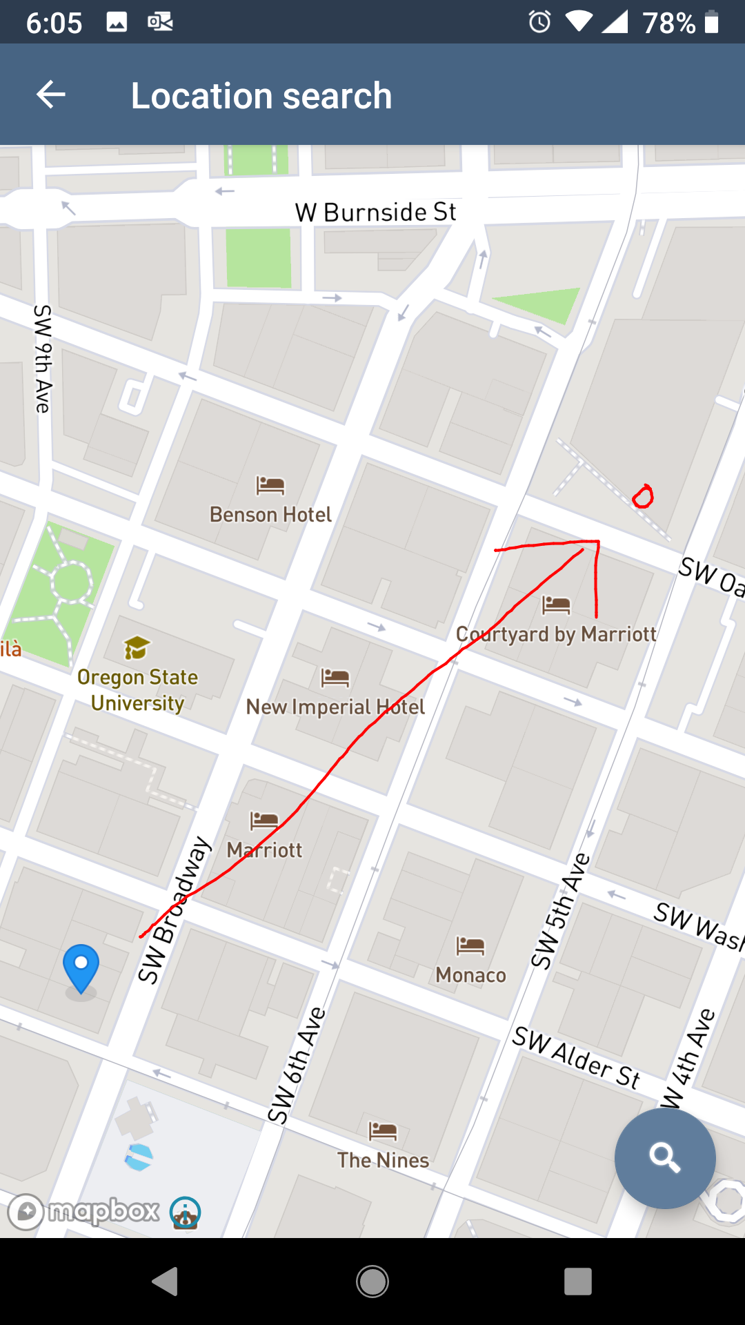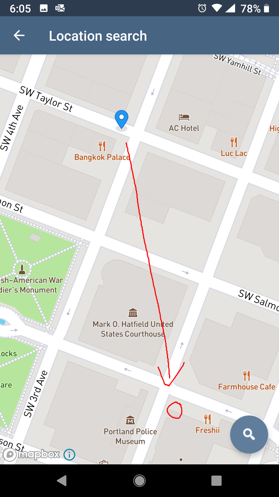 The search feature returns coordinates up to several blocks away from the selected location. This happens in both my own app and the demo app, tested on 2 different devices. These pictures from the demo app show the marker and expected location of several Starbucks locations in Portland.