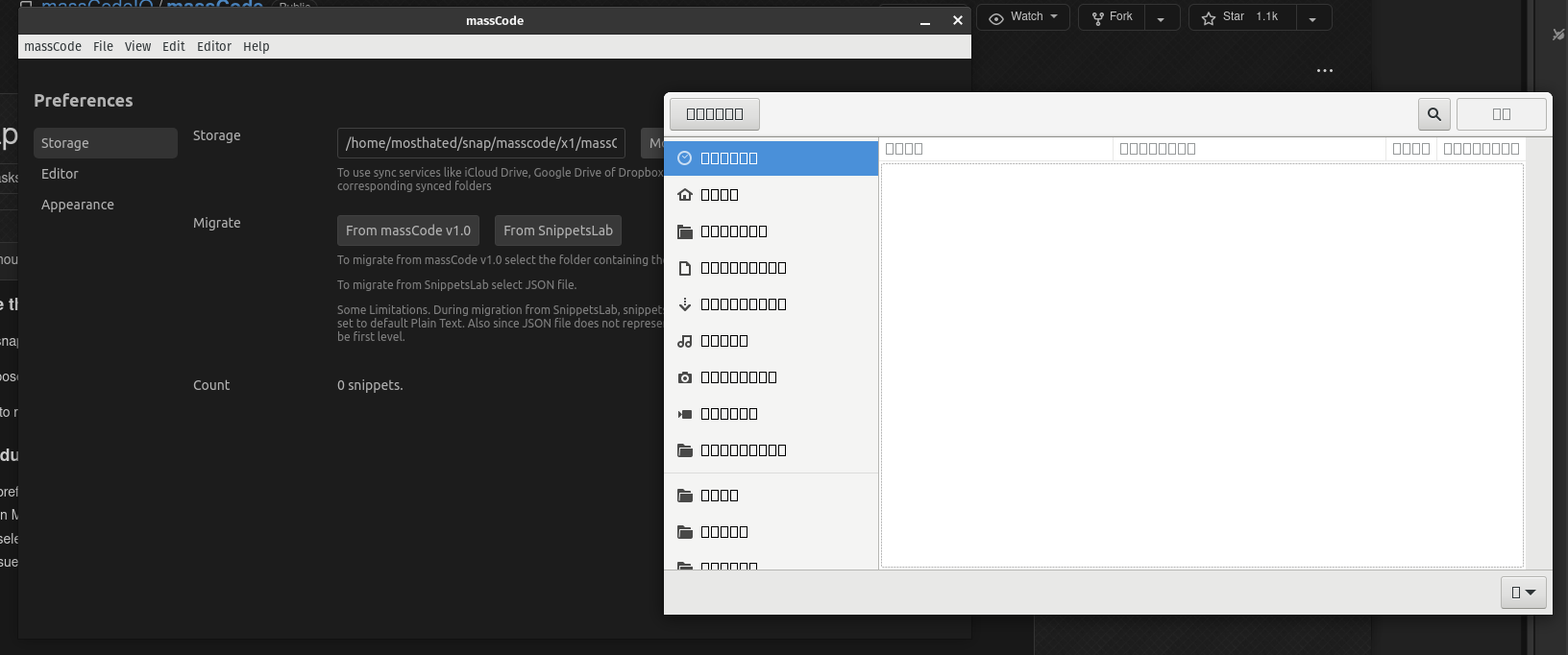 temporary solution: (1)add the directory to the left column of nautilus (2)edit the snapcraft.yaml file,change "confinement: strict" to "confinement: devmode". (3)rebuild massCode (4)reinstall massCode。