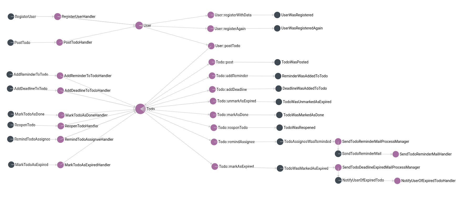 The one problem I have right now is that the JSON is missing information about which method on the aggregate root is called by which command handler. It's visible even in your example image - for example it's not clear that AddReminderToTodoHandler calls Todo::addReminder(). Could this be added somehow?