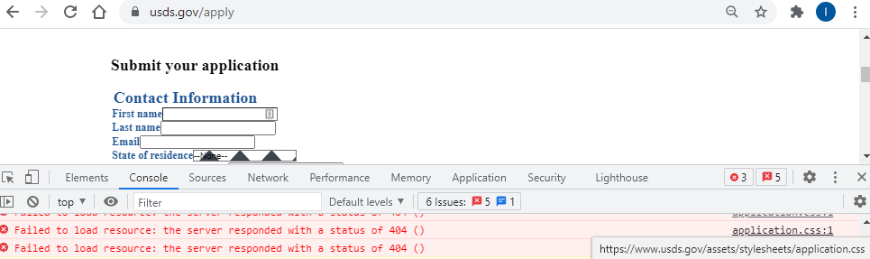 The /apply page is not rendering as expected.