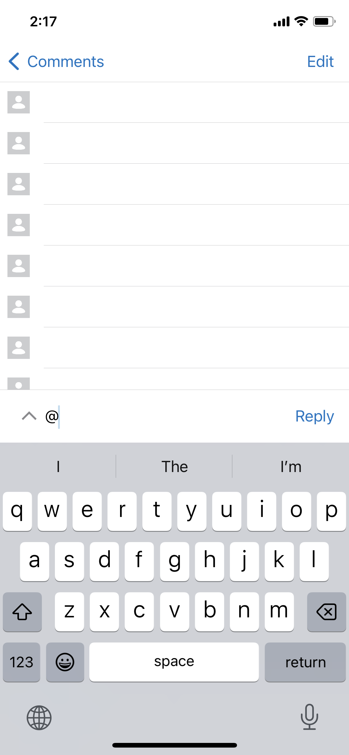 1 - Tap the "My Site" tab. 2 - Tap on "Menu" 3 - Tap on "Comments" row. 4 - Tap any comment. 5 - Tap "Reply" button. 6 - Type "@". You should see the suggestions list. Tap on the chevron up button: the reply input is expanded and the suggestions list either lags or appears blank especially on first invocation.